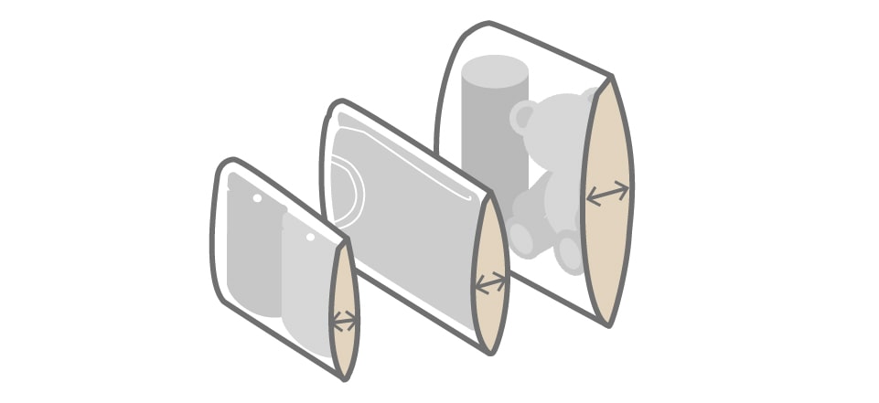 商品の大きさ、厚みに合わせて、横マチ(ガセット)が膨らみ、中の商品が動きにくいよう、やさしくホールド。ぴったりサイズでムダなくフィットします。