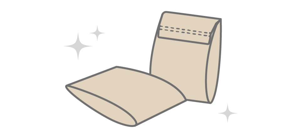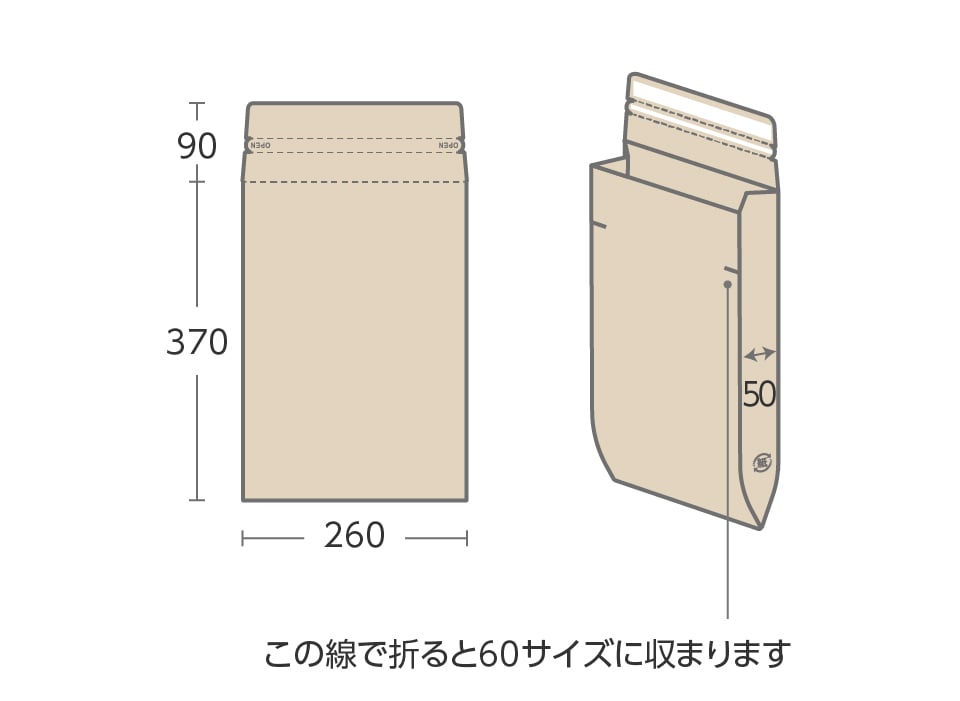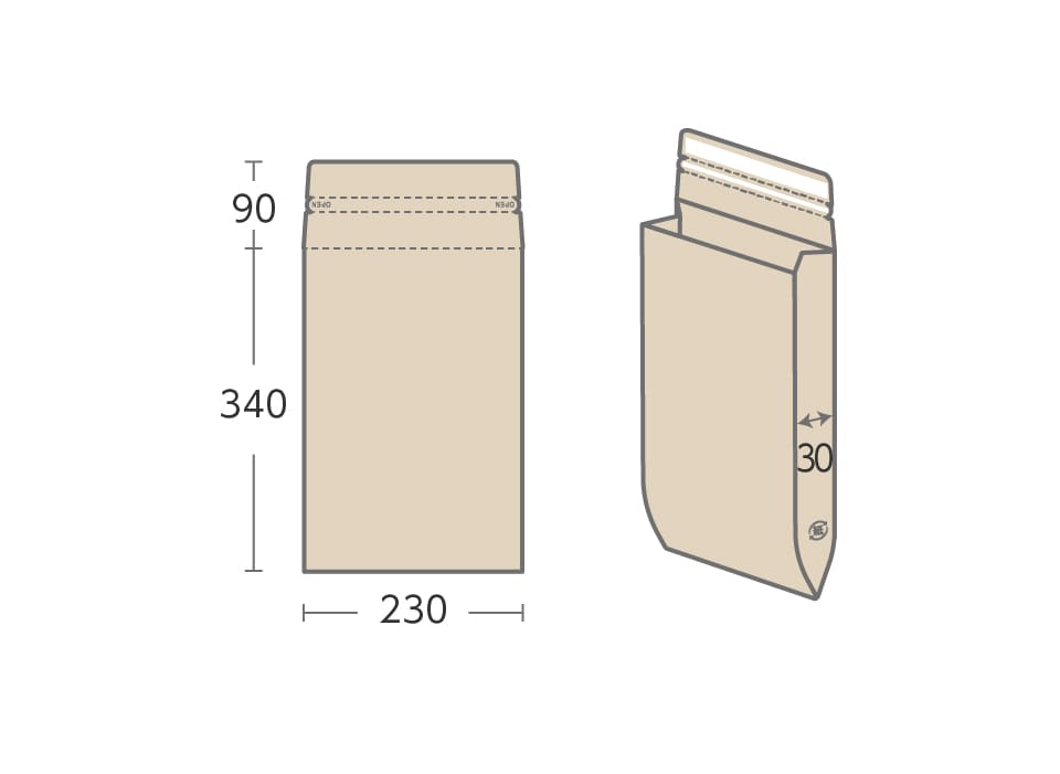 底の平面がなく、横マチのみが膨らむ、スマートな荷姿。ブランドロゴデザイン等を配置することで、包装紙を兼ねたパッケージとしてもご使用いただけます。