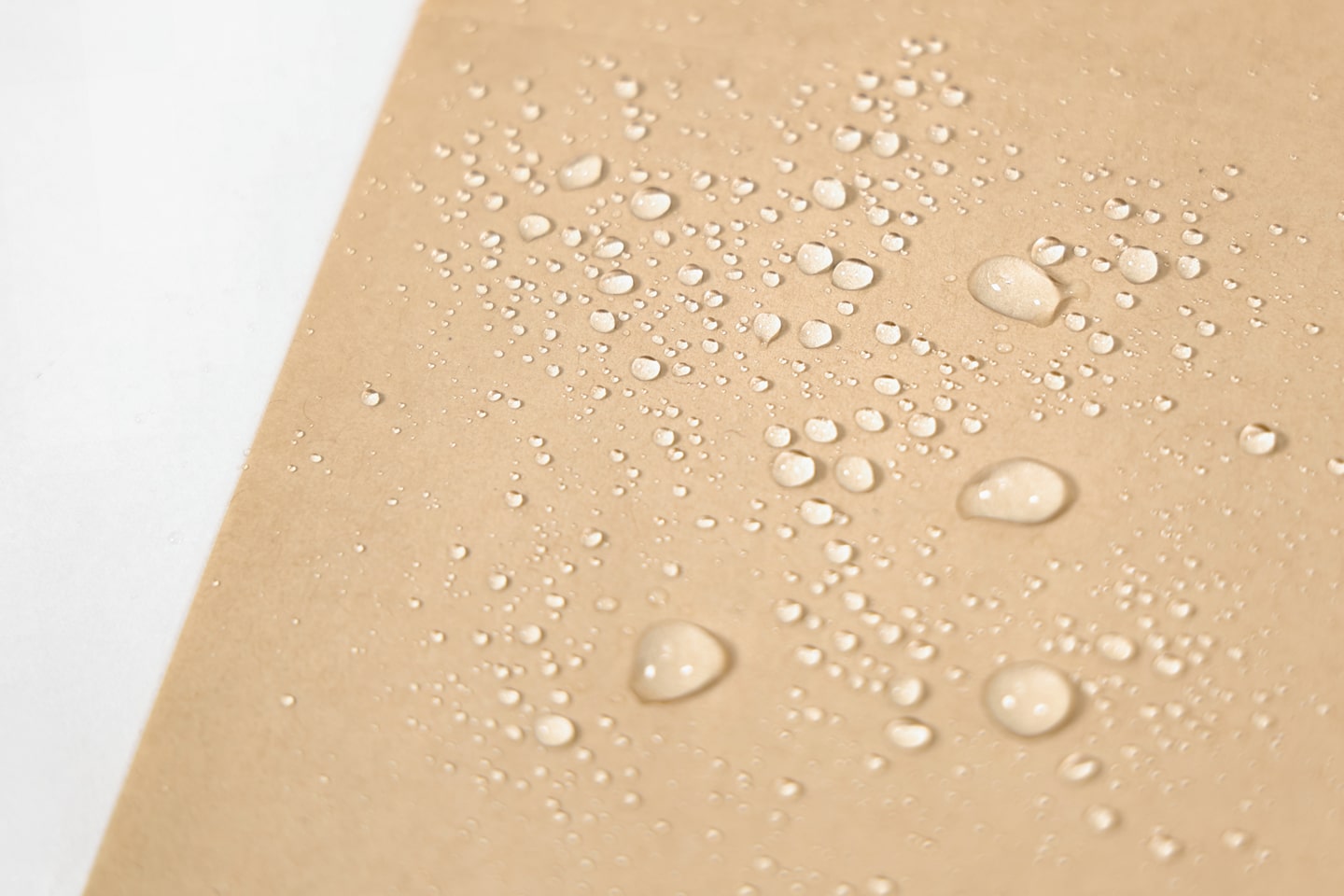 丈夫な紙質はそのままに表面が濡れてもしみこまず、水滴となってはじき、流れ落ちます。