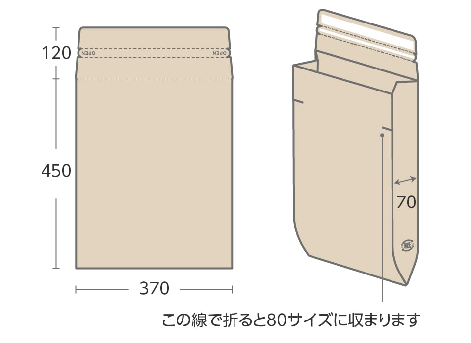 フタ部分で曲げると宅配便の100サイズに相当し、ウラ面両端の線部分で折り曲げると80サイズに収まります。