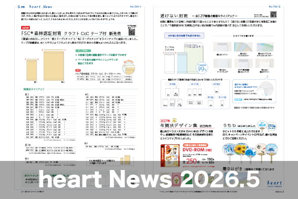 パッケージや包材分野でも新たな価値を提案いたします ご相談は下記より承ります お問い合わせ お見積 私たちは封筒や名刺をはじめ、紙製クリアファイルやアップサイクル製品など、さまざまな紙製品の企画開発から製造販売まで一貫して行っております。脱プラスチックやSDGsへの取り組み、環境保全ニーズの高まりを受け、事務用品の領域を超え「心を包む」「想いを届ける」「魅せる」をコンセプトに、パッケージや包装分野でも“紙への素材シフト”を提案してまいります。 新着情報 一覧を見る すべて お知らせ 製品情報 ハートニュース 展示会 2026/04/24 お知らせ 2026年 うちわ のWebカタログを公開しました 2026/04/20 お知らせ製品情報 EC発送用の紙製包装資材「ECバッグ」3種 新発売 2026/04/06 お知らせ Instagram3月ハイライト 2026/04/02 お知らせ 返信用封筒の書き方(製品まめ知識)のページを公開しました 2026/03/25 ハートニュース heart News 2026年4月号 2026/03/10 お知らせ データ作成用テンプレートに角3封筒を追加しました 2026/03/05 お知らせ Instagram2月ハイライト 2026/02/25 ハートニュース heart News 2026年3月号 2026/04/24 お知らせ 2026年 うちわ のWebカタログを公開しました 2026/04/20 お知らせ製品情報 EC発送用の紙製包装資材「ECバッグ」3種 新発売 2026/04/06 お知らせ Instagram3月ハイライト 2026/04/02 お知らせ 返信用封筒の書き方(製品まめ知識)のページを公開しました 2026/03/10 お知らせ データ作成用テンプレートに角3封筒を追加しました 2026/03/05 お知らせ Instagram2月ハイライト 2026/02/17 お知らせ データ作成用テンプレートに長4封筒を追加しました 2026/02/06 お知らせ 公式 Instagram1月ハイライト 2026/04/20 お知らせ製品情報 EC発送用の紙製包装資材「ECバッグ」3種 新発売 2025/11/20 お知らせ製品情報 ホワイトケントCoC封筒 洋2に新たな仲間が登場! 2025/11/04 お知らせ製品情報 お年玉付き年賀はがきへの絵柄印刷・箔押加工 受付開始 2025/09/22 お知らせ製品情報 ホワイトケントCoC封筒に ダイヤ洋2サイズが新登場! 2025/09/08 お知らせ製品情報 2026年 午年 年始ポスター 受付開始 2025/08/22 お知らせ製品情報 返信用封筒の製品詳細ページを新たに公開しました 2025/07/04 お知らせ製品情報 eコマースバッグのブランドサイトを公開しました 2025/05/21 お知らせ製品情報 2026年「午」年賀状デザイン集 DVD-ROM 販売開始 2026/03/25 ハートニュース heart News 2026年4月号 2026/02/25 ハートニュース heart News 2026年3月号 2026/01/26 ハートニュース heart News 2026年2月号 2025/12/25 ハートニュース heart News 2026年1月号 2025/11/25 ハートニュース heart News 2025年12月号 2025/10/27 ハートニュース heart News 2025年11月号 2025/09/25 ハートニュース heart News 2025年10月号 2025/08/25 ハートニュース heart News 2025年9月号 2025/09/19 お知らせ展示会 FaW TOKYO(ファッションワールド東京)2025 秋 出展のお知らせ 製品情報 すべての製品を見る eコマースバッグ(包装資材) ワックスプラス 紙製クリアファイル 透けない封筒 撥水封筒 かんたん開封封筒 A4エコ窓封筒 ワックス窓封筒 宛名を見ながら封かんできる窓封筒 返信用封筒 FSC森林認証 ホワイトケントCoC アップサイクル SIAA認証製品 (抗菌・抗ウイルス) 賞状用紙 サポート情報 製品まめ知識 企業情報 サステナビリティ 採用情報 事業所一覧