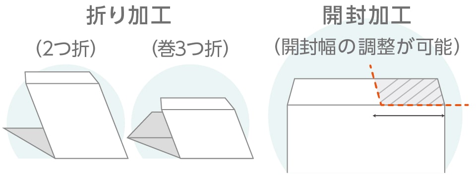返信用封筒を入れるための折り加工や第三種・第四種郵便物の送付用に開封加工も承っております。