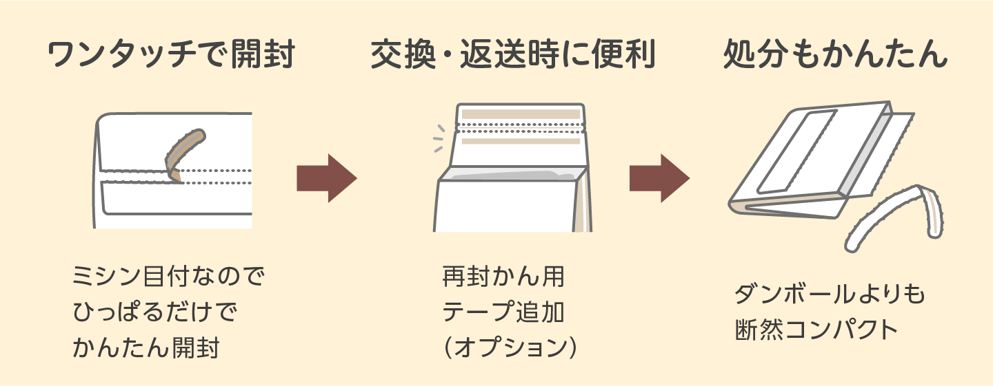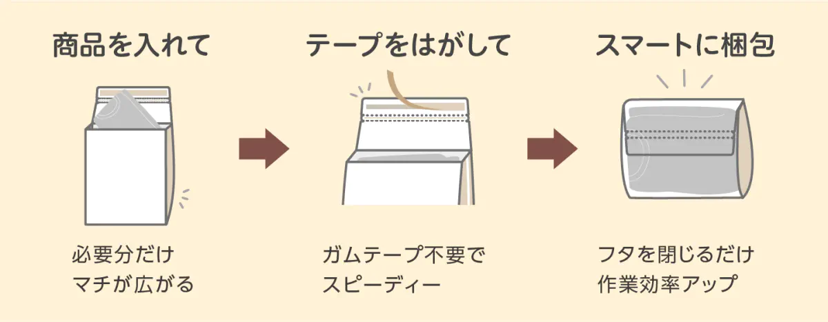 - 商品を入れてテープで閉じるだけで誰でもキレイな包装が可能に