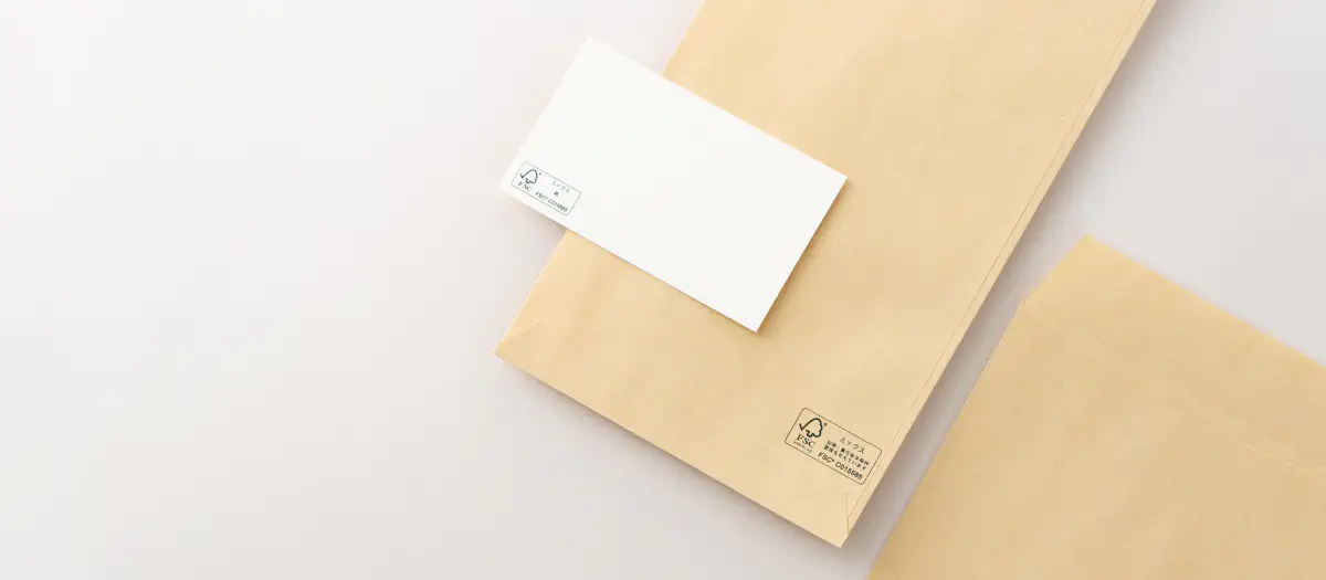 当社では、FSC森林認証紙を使用した環境配慮型製品として、封筒・名刺・宅配袋など、さまざまなアイテムを展開しています。FSC認証に基づく紙を使用することで、森林資源の保全に配慮しながら、企業の環境方針やSDGsへの取り組みを、製品を通じて分かりやすく伝えることが可能です。
