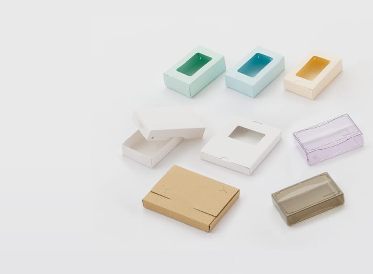 再生紙(ダンボール素材)使用の天窓付き紙箱と、再生プラスチックを使用した内容物が見やすい透明度を高めたポリ箱です。